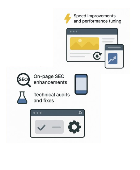 A slow site can cost you traffic, leads, and rankings. We fine-tune every aspect of your website for maximum performance. From loading speeds to search engine visibility, our optimization services ensure your site delivers a smooth, fast experience that users — and Google — will love.